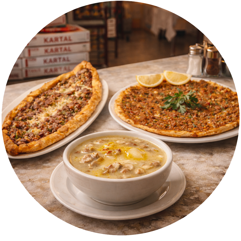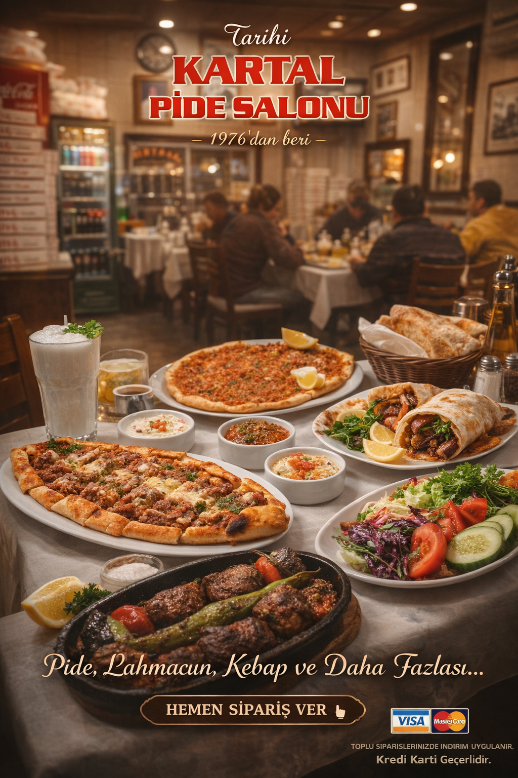 KartalPide’de yemek seçmek gerçekten zor çünkü burada pide, kebap, lahmacun ve kiremitte yapılan her şey gerçek bir ustalıkla hazırlanıyor. Daha ilk lokmada “iyi ki buraya gelmişim” dedirten bir lezzet dünyası sizi bekliyor. Eğer ilk kez geliyorsanız ya da “en sevilenlerden başlayayım” diyorsanız doğru bölgeyi inceliyorsunuz :)