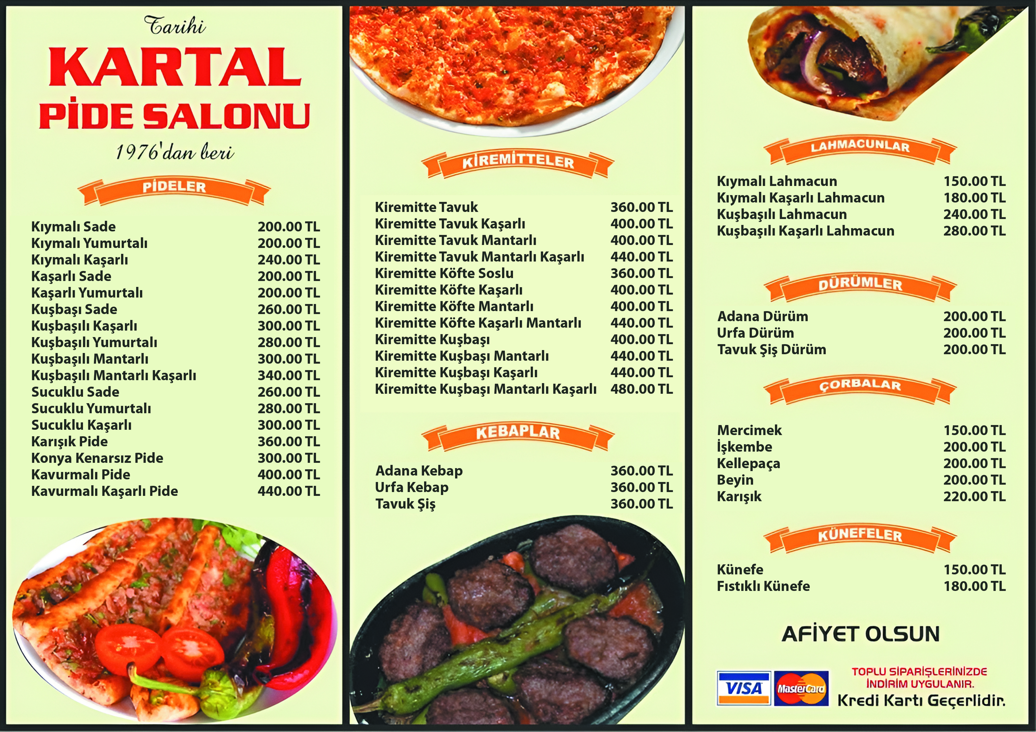 KartalPide’de yemek seçmek gerçekten zor çünkü burada pide, kebap, lahmacun ve kiremitte yapılan her şey gerçek bir ustalıkla hazırlanıyor. Daha ilk lokmada “iyi ki buraya gelmişim” dedirten bir lezzet dünyası sizi bekliyor. Eğer ilk kez geliyorsanız ya da “en sevilenlerden başlayayım” diyorsanız doğru bölgeyi inceliyorsunuz :)